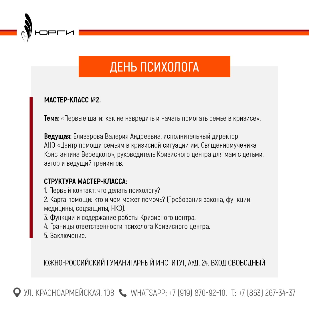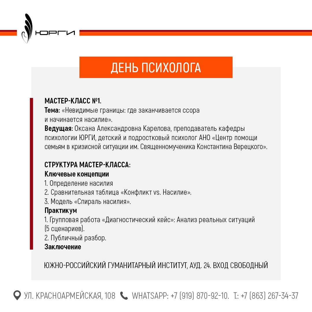 21 ноября 2025 года с 18 до 20.00 в честь Дня психолога Факультет практической психологии будет проводить мастер-классы на тему: «Психологическое насилие в семье: теория и анализ реальных ситуаций» Аудитория 24. Вход бесплатный.